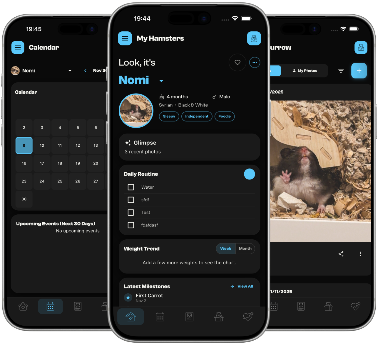 NOMI is a cozy little app designed to make hamster care effortless, organised, and a little bit magical. Track, plan, and celebrate every whisker twitch — soon on iOS & Android.